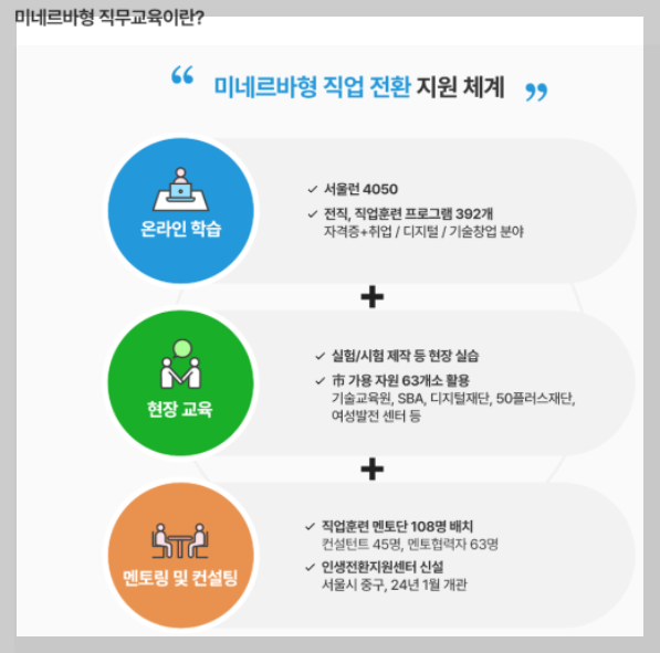 - ‘서울런 4050’을 통해 이·전직 등 중장년 직업전환을 위한 '미네르바형 직무교육*' 및 컨설팅을 비롯한 다양한 학습콘텐츠와 기능을 제공합니다.
