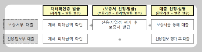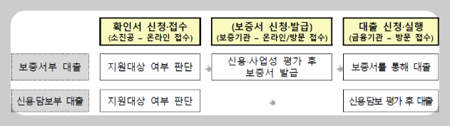 - 신용보증서 : 보증기관(지역신용보증재단, 신용보증기금, 기술보증기금)에서 보증평가 후 보증서를 발급받아, 보증서를 담보로 금융기관에서 대출진행